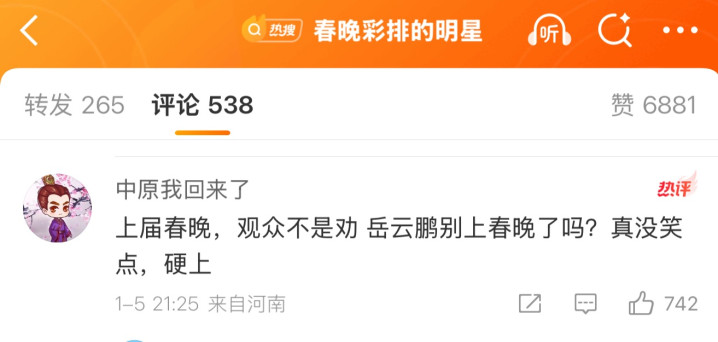 去年小岳岳自己玩梗,问台下观众对春晚上的岳云鹏有什么建议,观众直接说“建议他别上春晚”。