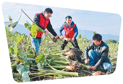 安和镇青年党员干部在文塘村与致富带头人(右一)为采收的槟榔芋清理泥土、剪除残根。 图为伍艳妮摄